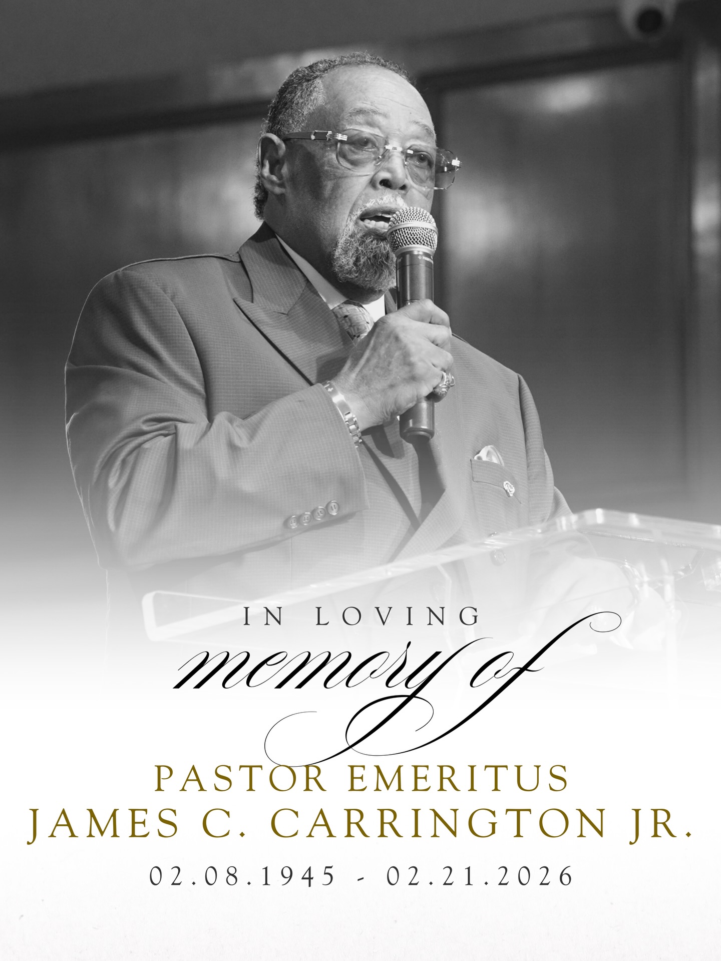 With profound sorrow, yet unwavering faith in the promises of God, the family of Pastor Emeritus James C. Carrington announces his peaceful transition into eternal rest on Saturday, February 21, 2026, at 4:25 p.m., surrounded by his loving family.